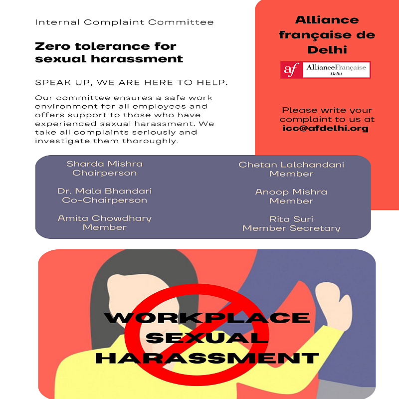 Alliance Française de Delhi is committed to upholding a healthy working environment that enables employees and students to work and study without fear of prejudice, gender bias, and sexual harassment.