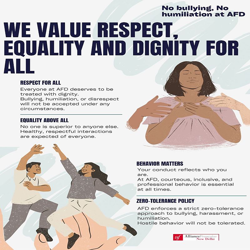 Alliance Française de Delhi is committed to upholding a healthy working environment that enables employees and students to work and study without fear of prejudice, gender bias, and sexual harassment.
