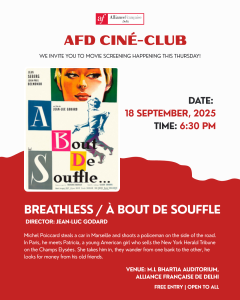 Alliance Française de Delhi is delighted to invite you to the screening of Breathless (À bout de souffle), a masterpiece of French New Wave cinema directed by Jean-Luc Godard.