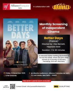 The Aravali Film Festival, in collaboration with Alliance Française de Delhi, invites you to the International Premiere of the French feature film Better Days, directed by Elsa Bennett and Hippolyte Dard, and produced by Dai Dai Films.