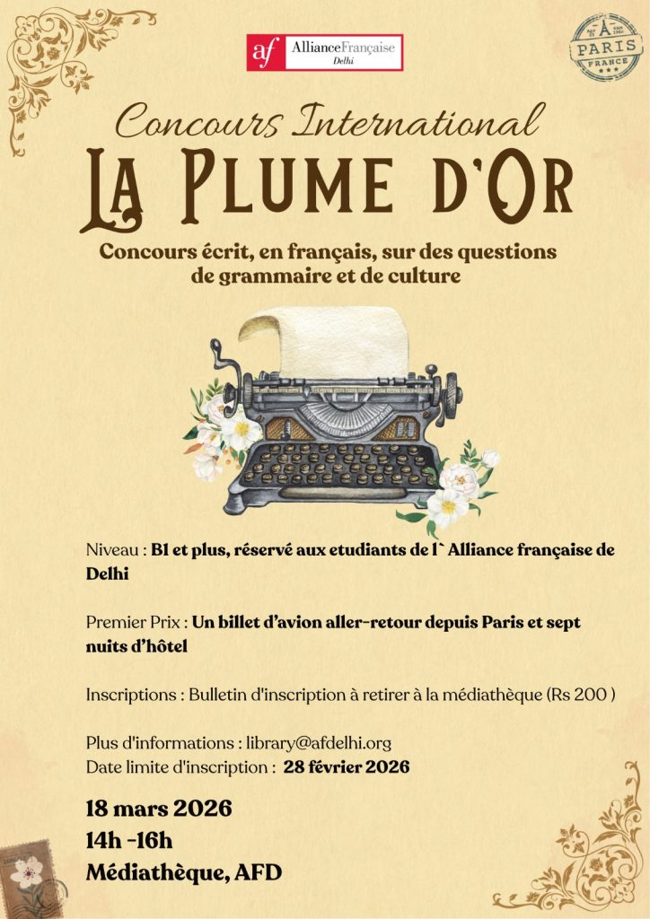 Alliance Française de Delhi invites its students to participate in La Plume d’Or 2026, one of the most prestigious international French writing competitions, bringing together French learners from across the world.